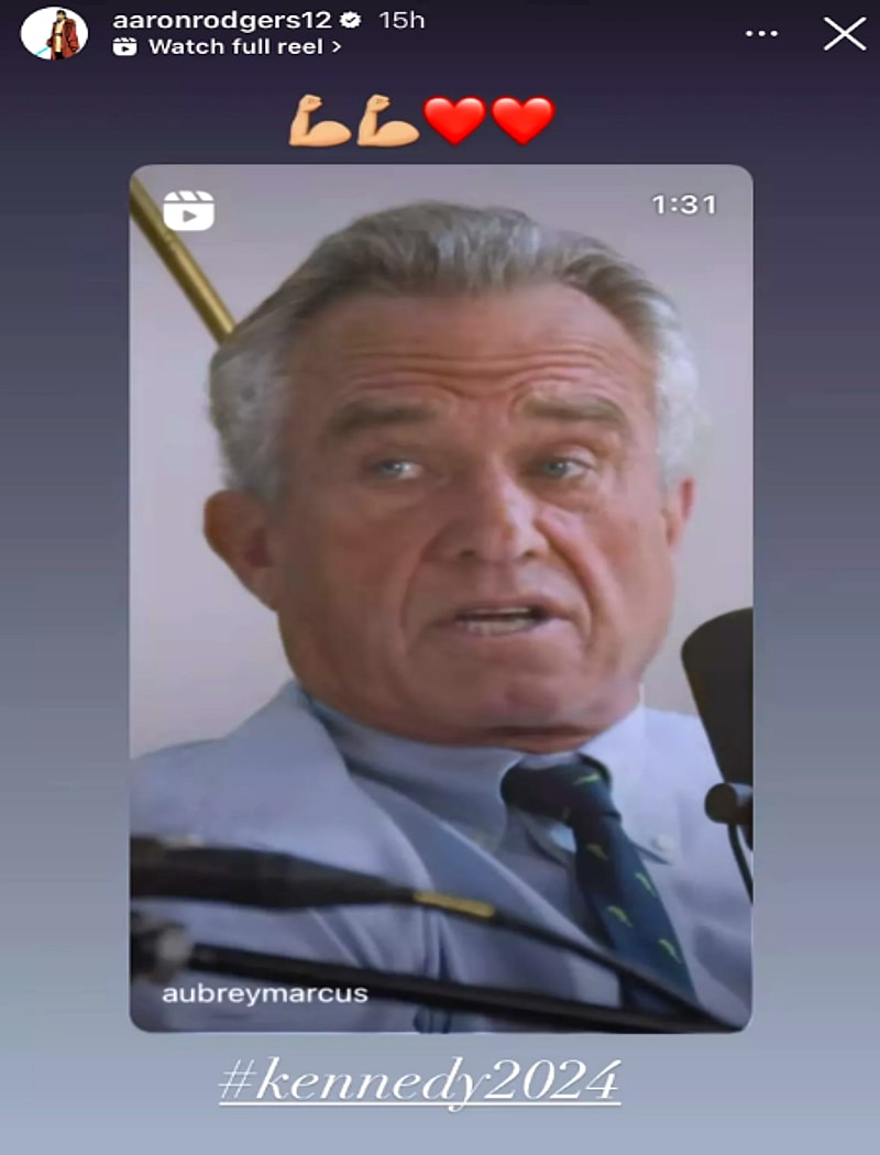 The Packers quarterback reposted a teaser video for an interview with Kennedy conducted by Aubrey Marcus on his Instagram Story, he captioned the clip with muscle and heart emojis, and included the phrase #kennedy2024.