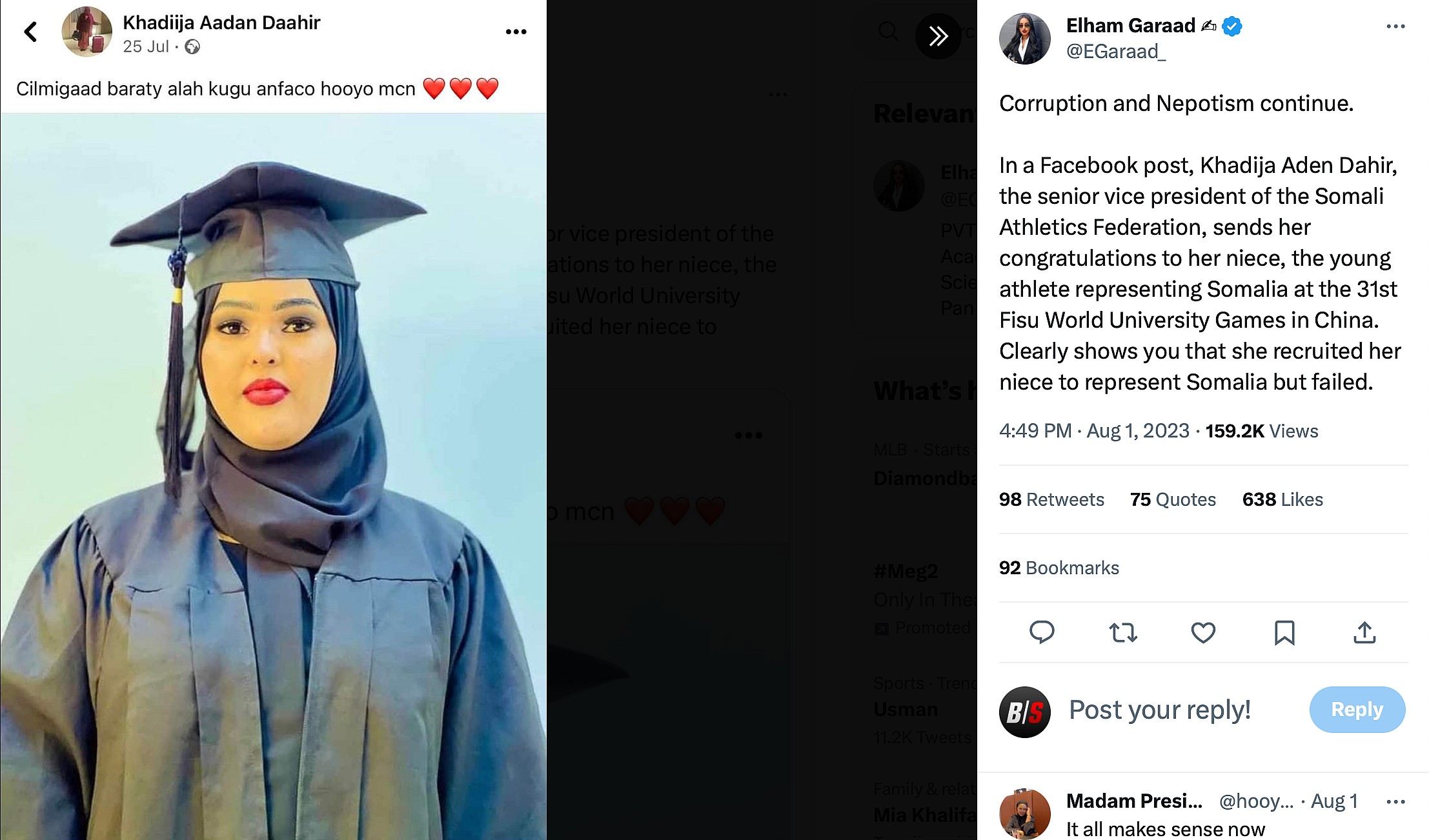 “Corruption and Nepotism continue,” she continued in a following tweet. “In a Facebook post, Khadijah Aden Tahir, the senior vice president of the Somali Athletics Federation, sends her congratulations to her niece, the young athlete representing Somalia at the 31st Fisu World University Games in China.