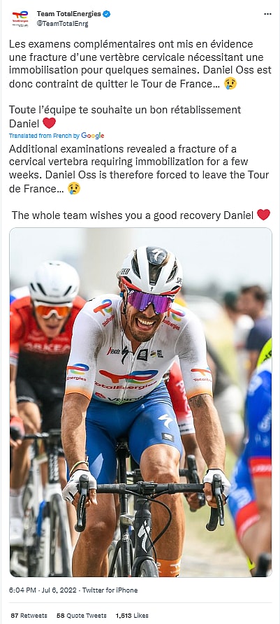 Oss’s cycling team, Team TotalEnergies announced on Twitter, “Additional examinations revealed a fracture of a cervical vertebra requiring immobilization for a few weeks. Daniel Oss is therefore forced to leave the Tour de France…”