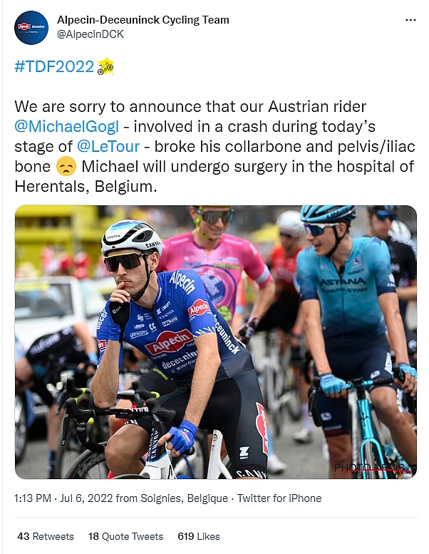 Alpecin-Deceuninck Cycling Team member Michael Gogl, also involved in the wreck pulled out of the Tour de France after breaking his collarbone and his pelvis/iliac bone.