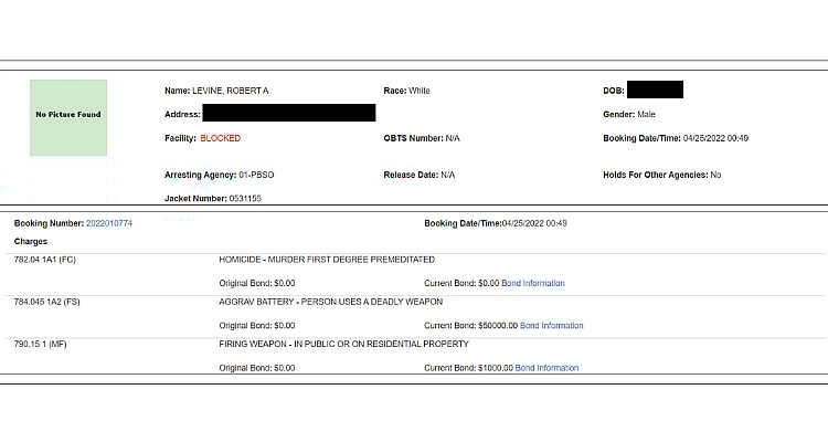 The Palm Beach County Sheriff’s Office reports that Levine has been charged with firing a weapon in public or in residential property, aggravated battery and using a deadly weapon, and attempted first degree premeditated murder.