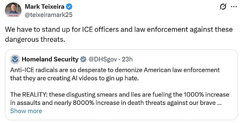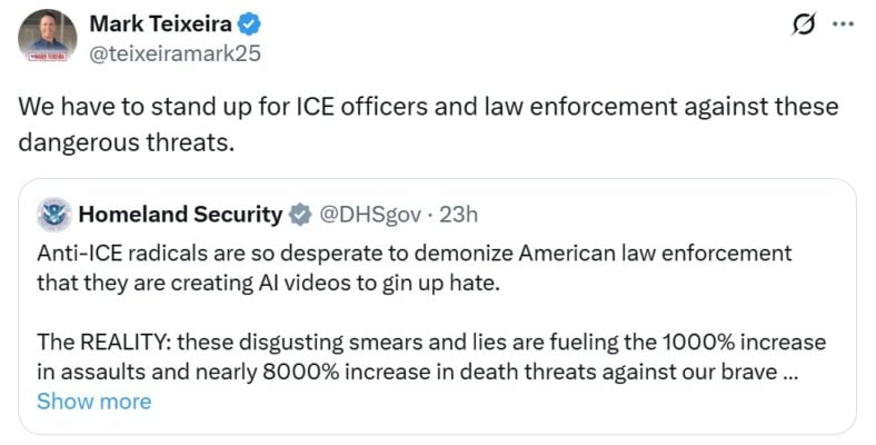 Former New York Yankees star and World Series champion Mark Teixeira publicly defended U.S. Immigration and Customs Enforcement (ICE) agents against escalating threats.