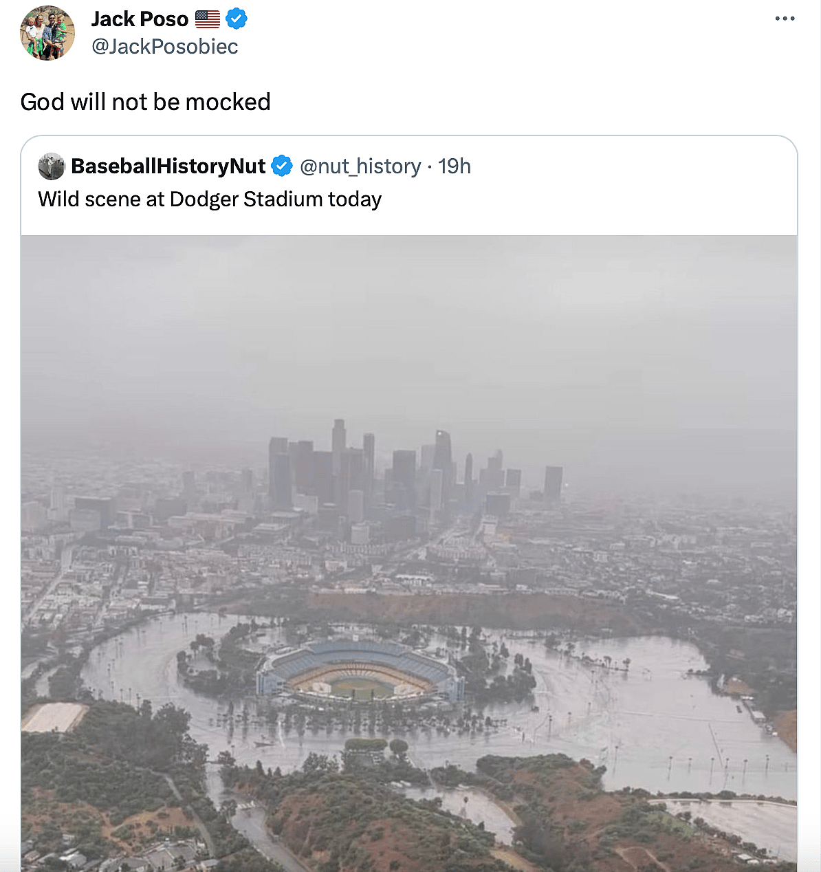 Hurricane Hilary is the first tropical storm to hit California in 84 years. A video depicted the historic stadium submerged, and many dubbed the situation a “Biblical flood.”