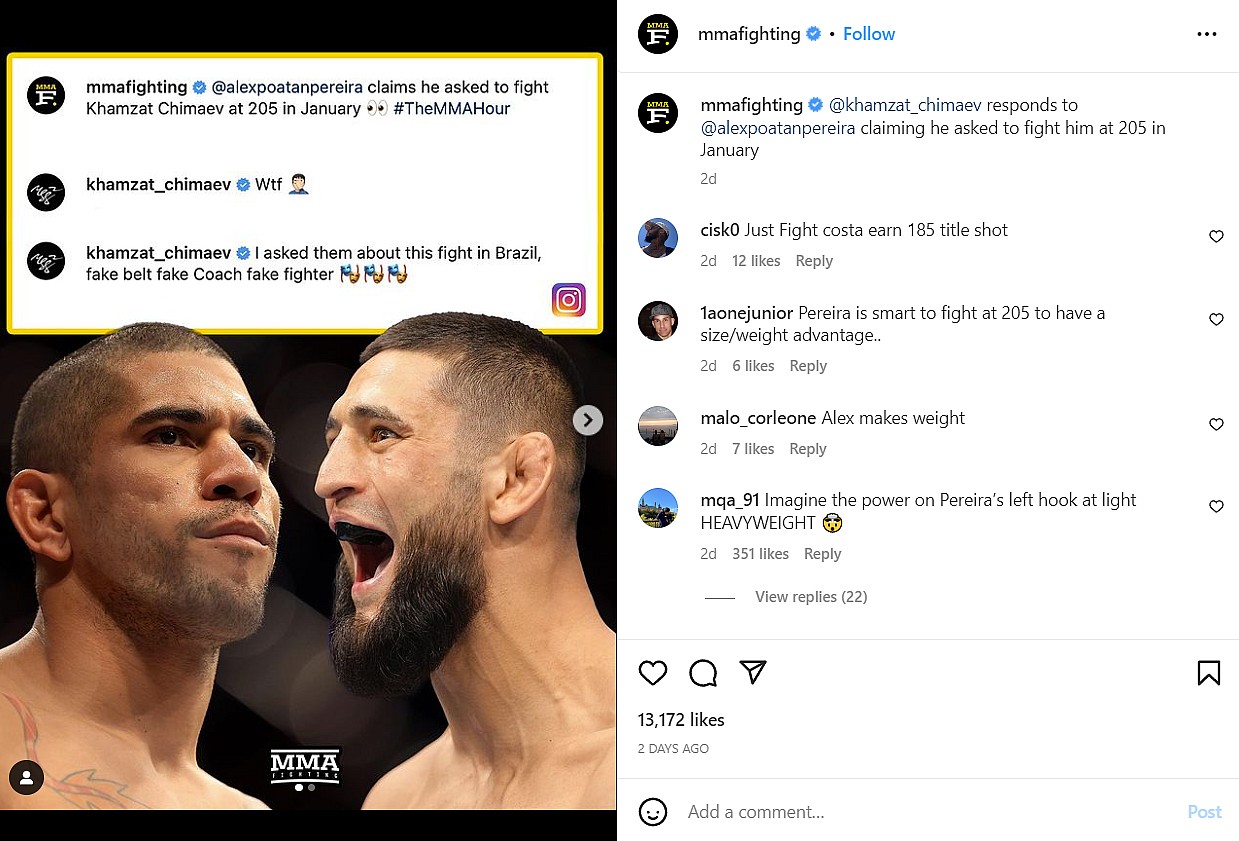 Chimaev and his team said that Pereira’s claims were inaccurate. “I asked them about this fight in Brazil,” Chimaev wrote on Instagram before calling Pereira a “fake fighter.”