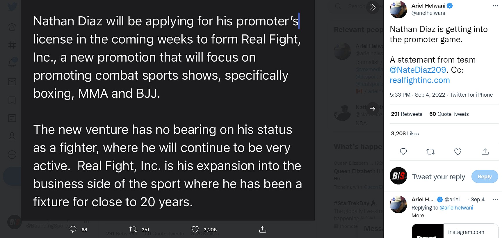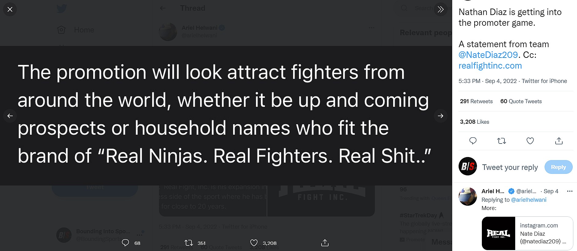 Diaz’s “Real Fight Inc.” will focus on hosting a variety of combat sport events including boxing, MMA, and Brazilian Jiu-Jitsu according to a statement from Diaz’s team shared to Twitter by Ariel Helwani.