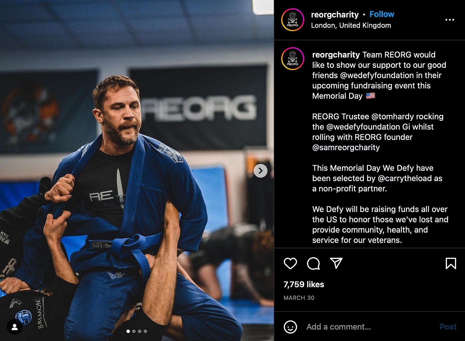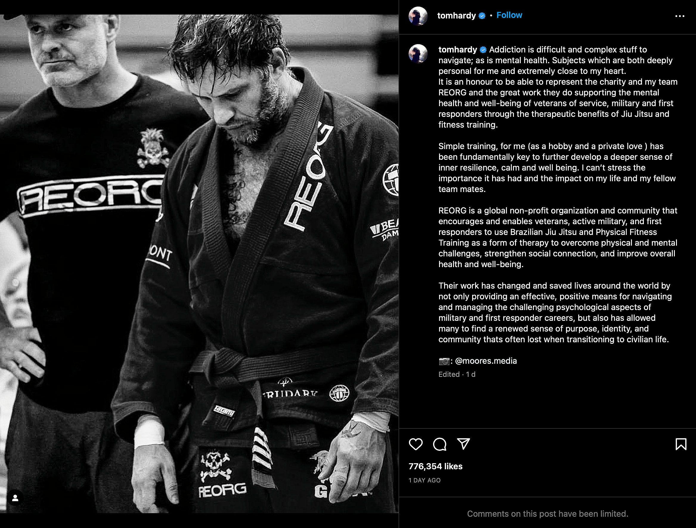 Providing insight on what this particular charity can do for individuals seeking help, Hardy explained, “REORG is a global non-profit organization and community that encourages and enables veterans, active military, and first responders to use Brazilian Jiu Jitsu and Physical Fitness Training as a form of therapy to overcome physical and mental challenges, strengthen social connection, and improve overall health and well-being.”