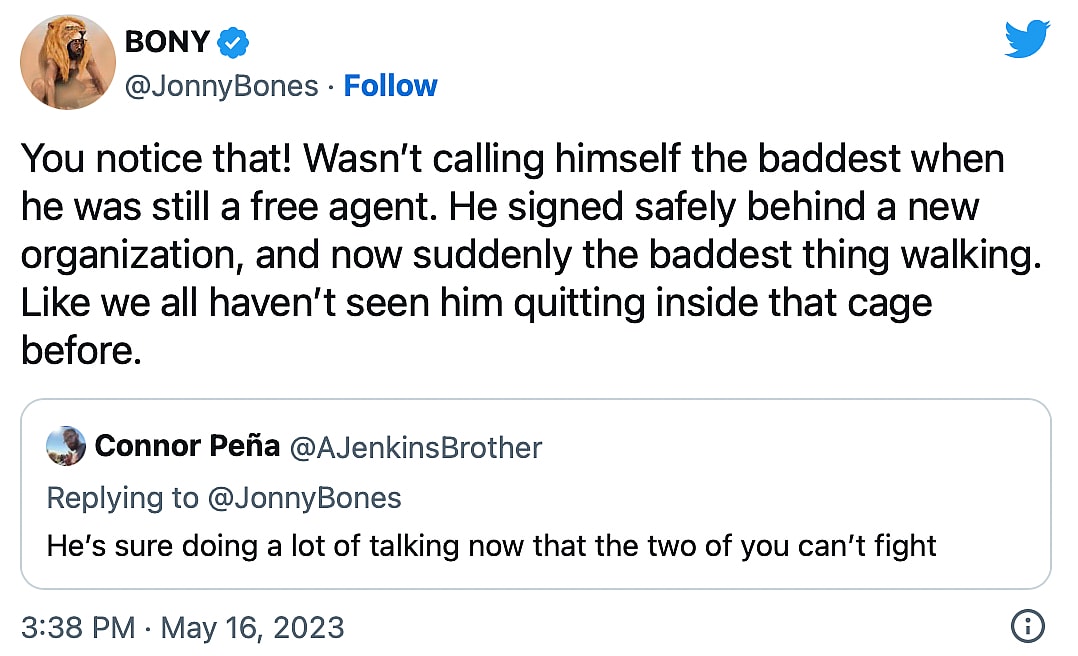 “You notice that!” Jones replied back. “Wasn’t calling himself the baddest when he was still a free agent. He signed safely behind a new organization, and now suddenly the baddest thing walking. Like we haven’t all seen him quitting inside that cage before.”
