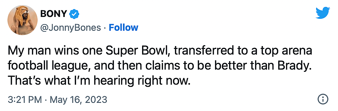 Jones then took it up a notch, saying, “My man wins one Super Bowl, transferred to a top arena football league, and then claims to be better than Brady. That’s what I’m hearing right now.”