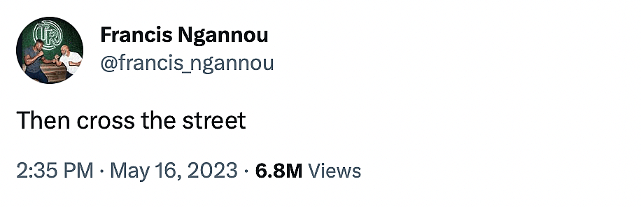 Ngannou replied to Jones, telling him to “cross the street,” as in leave the UFC and sign to fight the former heavyweight title holder again, this time over at the PFL.