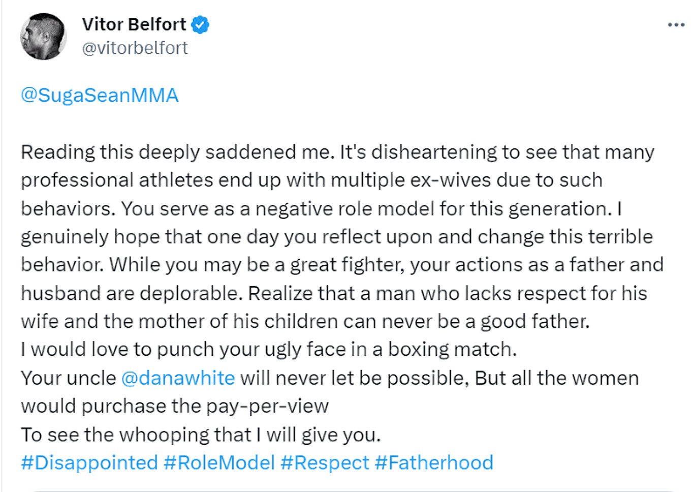 “Reading this deeply saddened me,” posted Belfort after learning how O’Malley treats his marriage. “It’s disheartening to see that many professional athletes end up with multiple ex-wives due to such behaviors.
