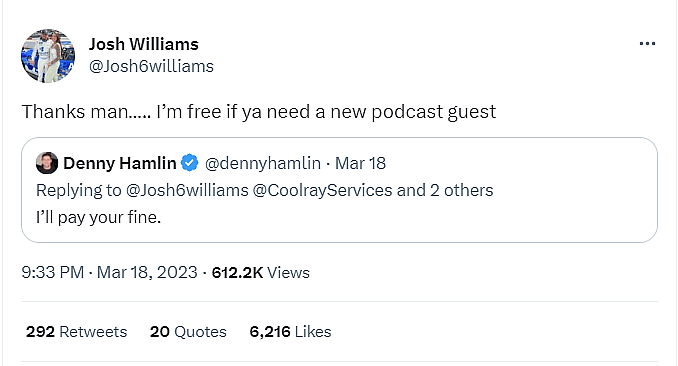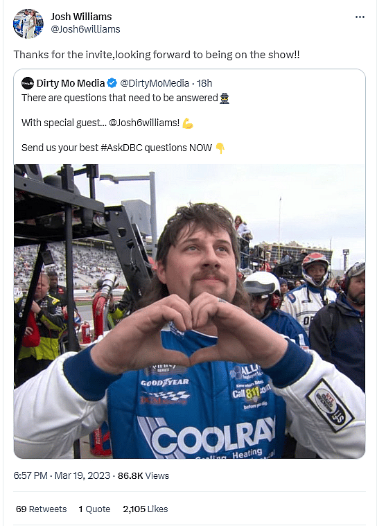 In a subsequent tweet he added, “Josh Williams’ car is now parked alongside the NASCAR hauler.”