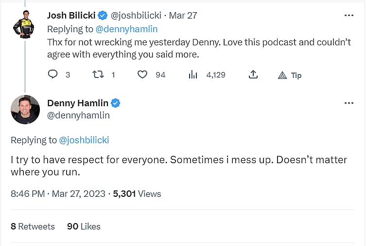 Hamlin also responded to fellow competitor Josh Bilicki who tweeted, “Thx for not wrecking me yesterday Denny. Love this podcast and couldn’t agree with everything you said more.”