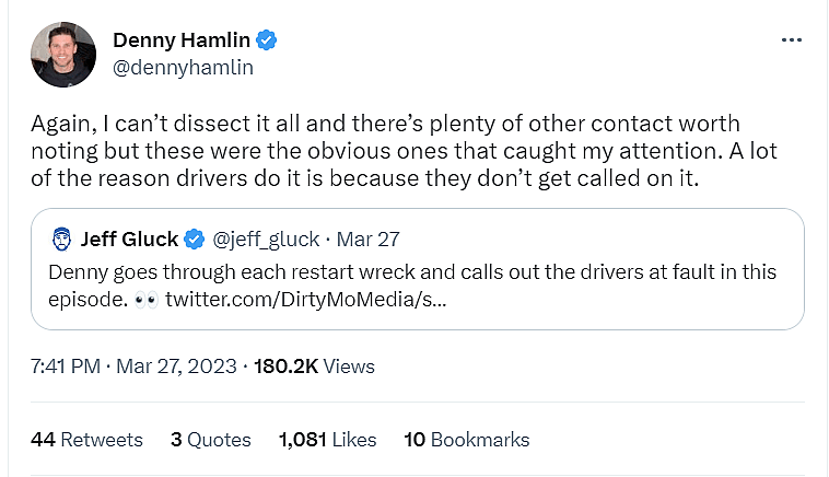 He tweeted, “Again, I can’t dissect it all and there’s plenty of other contact worth noting but these were the obvious ones that caught my attention. A lot of the reason drivers do it is because they don’t get called on it.”