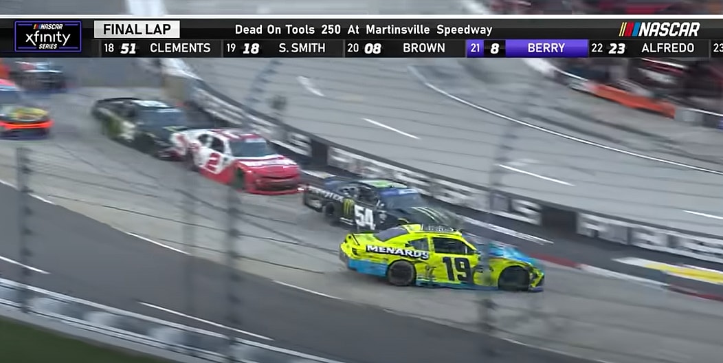 Gibbs intentionally wrecked Jones, his teammate, on the last lap of the race. After they took the white flag, Gibbs drove into the rear of Jones’ car sending him spinning into the outside wall. The wreck brought out the caution and ended the race according to NASCAR’s rules.