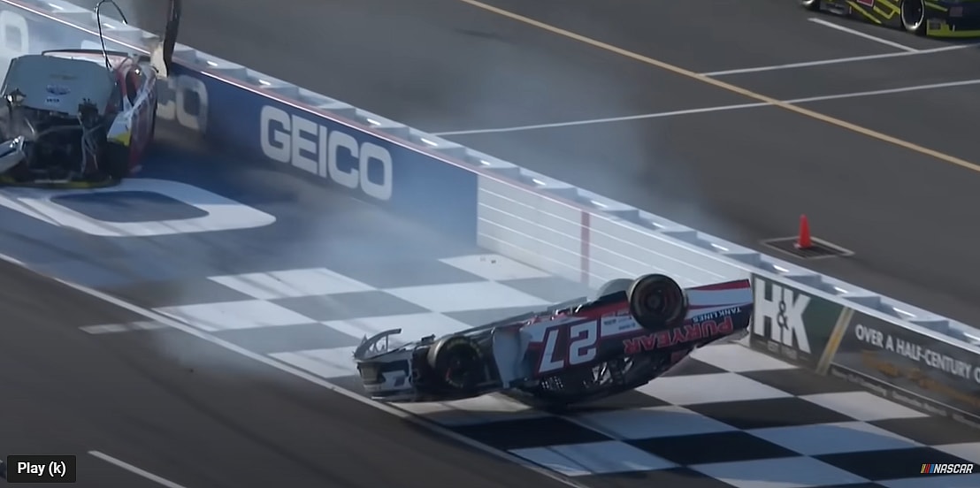 The violent collision would send Burton’s car airborne before flipping over and then sliding down the front stretch on his roof before finally coming to a stop,