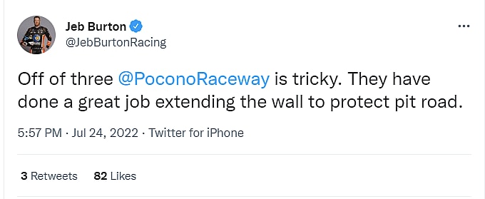 He later tweeted, “Off of three at Pocono Raceway is tricky. They have done a great job extending the wall to protect pit road.”