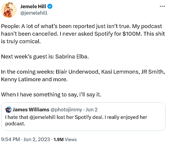 The longtime media personality is widely reported to be negotiating her exit from Spotify, where she has been the host of Jemele Hill is Unbothered since 2019, after her exit from ESPN. Multiple news outlets share the claim that she’s in search of a new platform for her show.