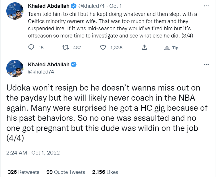 Abdallah concluded, “Udoka won’t resign bc he doesn’t wanna miss out on the payday but he will likely never coach in the NBA again. Many were surprised he got a HC gig because of his past behaviors. So no one was assaulted and no one got pregnant but this dude was wildin on the job.”