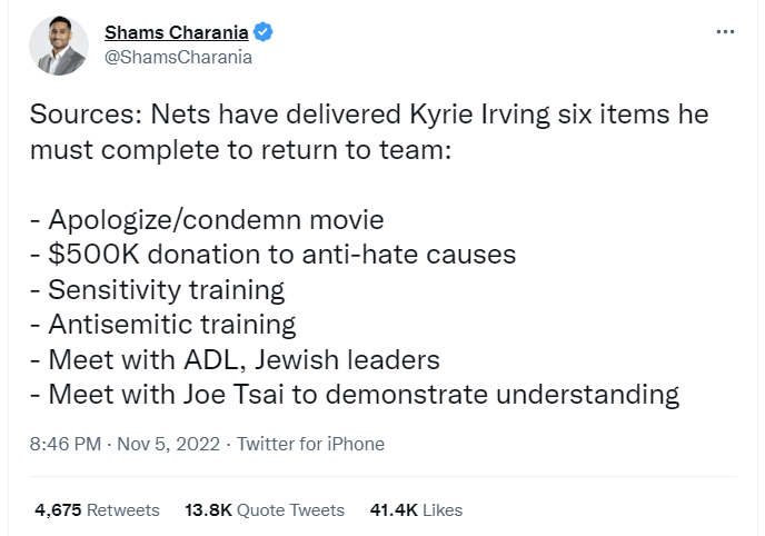 Charania wrote on Twitter, “Sources: Nets have delivered Kyrie Irving six items he must complete to return to team: – Apologize/condemn movie – $500K donation to anti-hate causes – Sensitivity training – Antisemitic training – Meet with ADL, Jewish leaders – Meet with Joe Tsai to demonstrate understanding.”