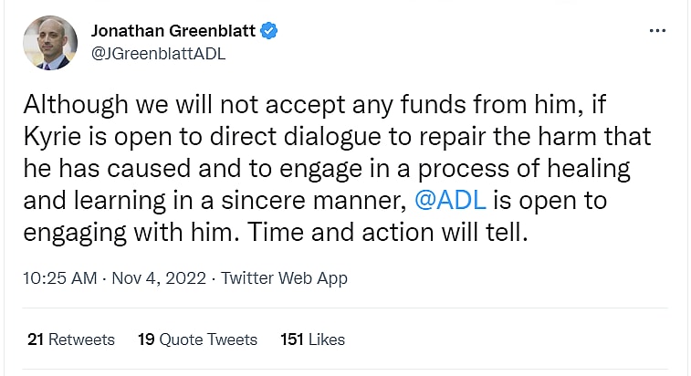 He wrote in a second tweet, “Although we will not accept any funds from him, if Kyrie is open to direct dialogue to repair the harm that he has caused and to engage in a process of healing and learning in a sincere manner, Anti-Defamation League is open to engaging with him. Time and action will tell.”