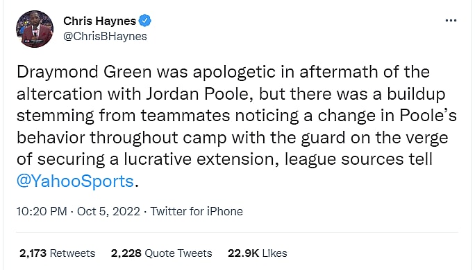 Yahoo Sports Senior NBA Insider Chris Haynes added, “Draymond Green was apologetic in aftermath of the altercation with Jordan Poole, but there was a buildup stemming from teammates noticing a change in Poole’s behavior throughout camp with the guard on the verge of securing a lucrative extension.”