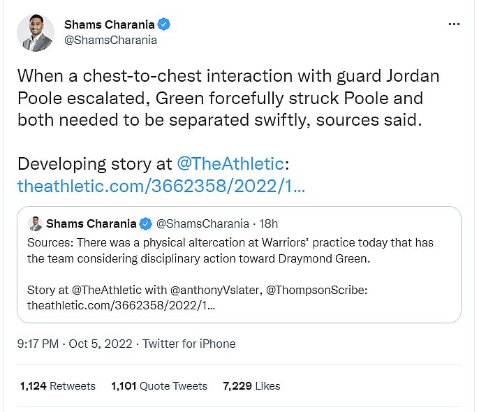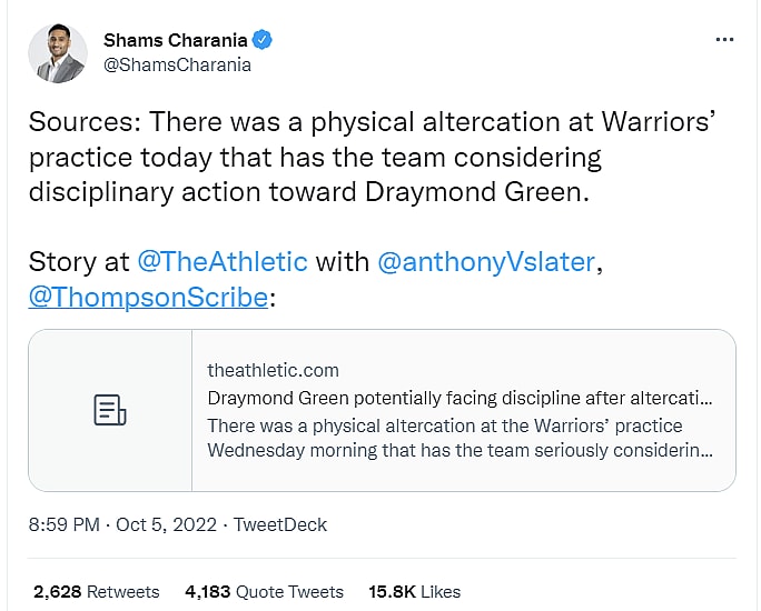 Charania wrote on Twitter, “There was a physical altercation at Warriors’ practice today that has the team considering disciplinary action toward Draymond Green.”