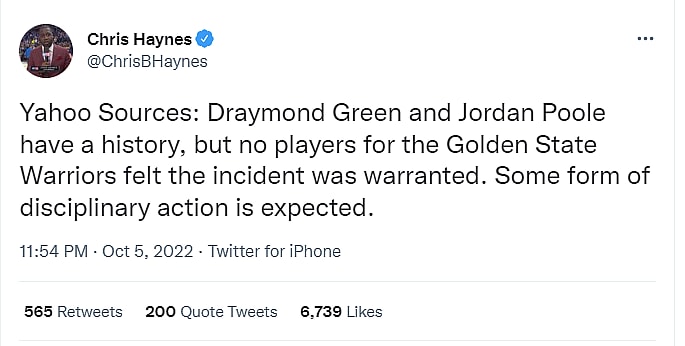 He added, “Draymond Green and Jordan Poole have a history, but no players for the Golden State Warriors felt the incident was warranted. Some form of disciplinary action is expected.”