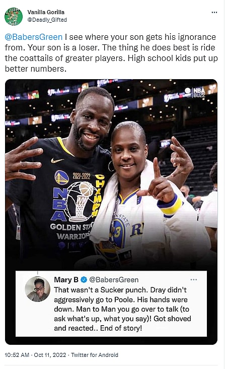 Draymond Green’s mom, Mary Babers Green, deleted her Twitter account after claiming that Draymond did not sucker punch Jordan Poole during a Golden State Warriors’ practice last week.