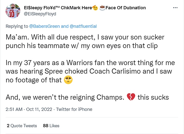 The user added, “In my 37 years as a Warriors fan the worst thing for me was hearing Spree choked Coach Carlisimo and I saw no footage of that. And, we weren’t the reigning Champs. this sucks.”