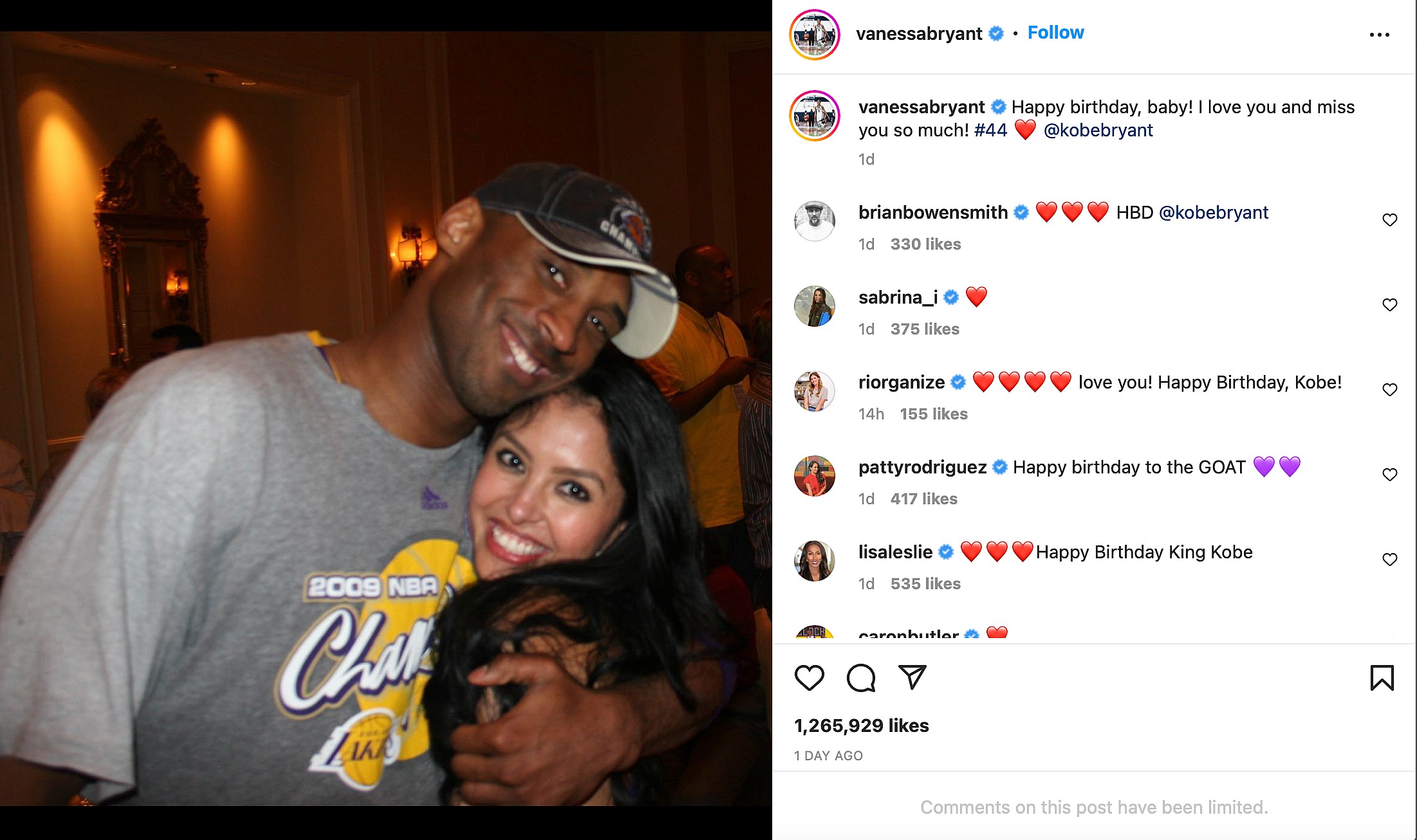 “Happy birthday, baby!” captioned Vanessa Bryant as she posted a photo of her and Kobe from way back in 2009. “I love you and miss you so much! #44 ❤️ @kobebryant”