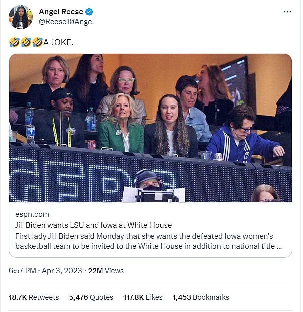 Reese also mentioned that Dr. Biden was supposed to come visit the LSU locker room prior to the game, but instead the team said no because President Biden had in fact “put somebody else to win the national championship” on his bracket, and they saw that as a bit insulting.