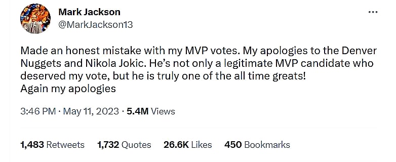 “Made an honest mistake with my MVP votes. My apologies to the Denver Nuggets and Nikola Jokic,” Jackson wrote. “He’s not only a legitimate MVP candidate who deserved my vote, but he is truly one of the all-time greats!”