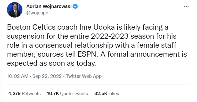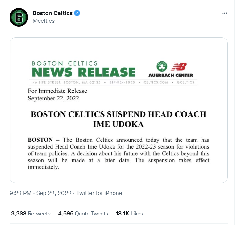 Udoka was suspended by the Boston Celtics for the entire 2022-23 season on September 22nd. The team announced, “The Boston Celtics announced today that the team has suspended Head Coach Ime Udoka for the 2022-2023 season for violations of team policies.”