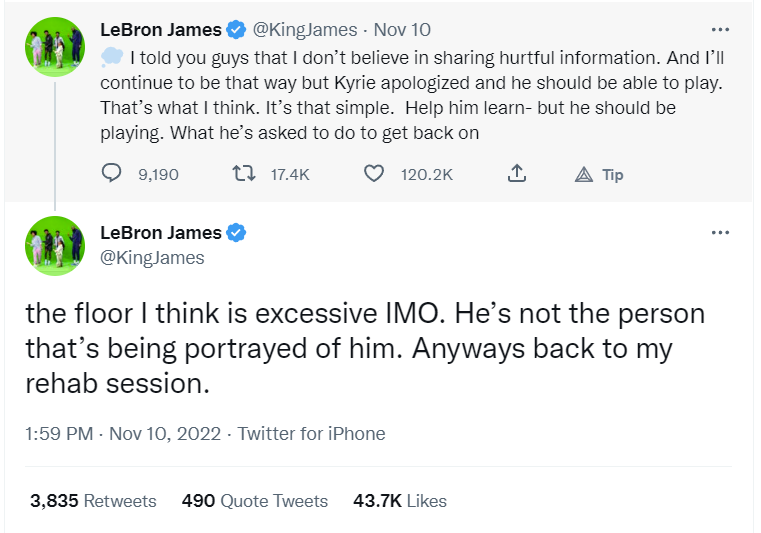 James tweeted, “I told you guys that I don’t believe in sharing hurtful information. And I’ll continue to be that way but Kyrie apologized and he should be able to play. That’s what I think. It’s that simple. Help him learn- but he should be playing. What he’s asked to do to get back on the floor I think is excessive IMO. He’s not the person that’s being portrayed of him. Anyways back to my rehab session.”
