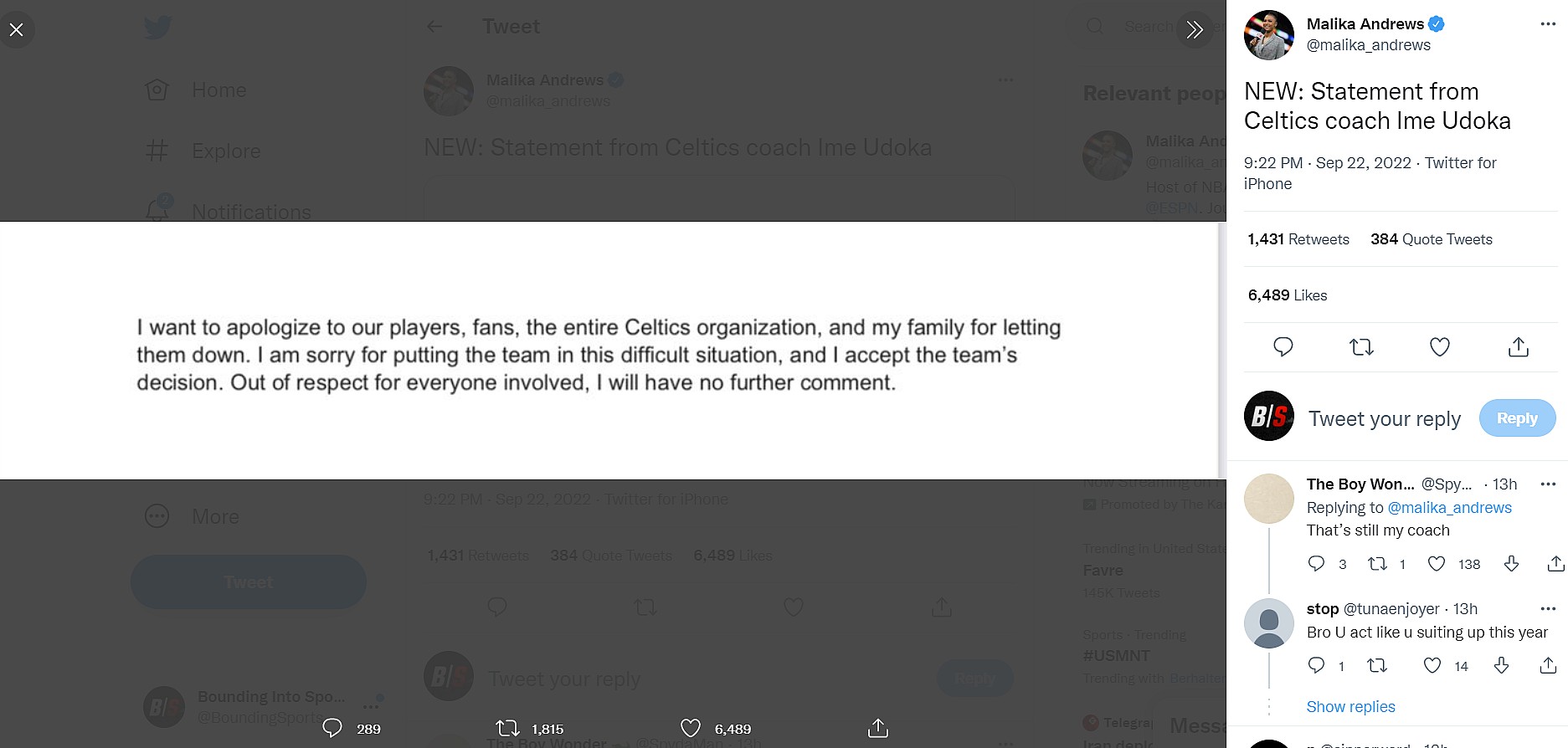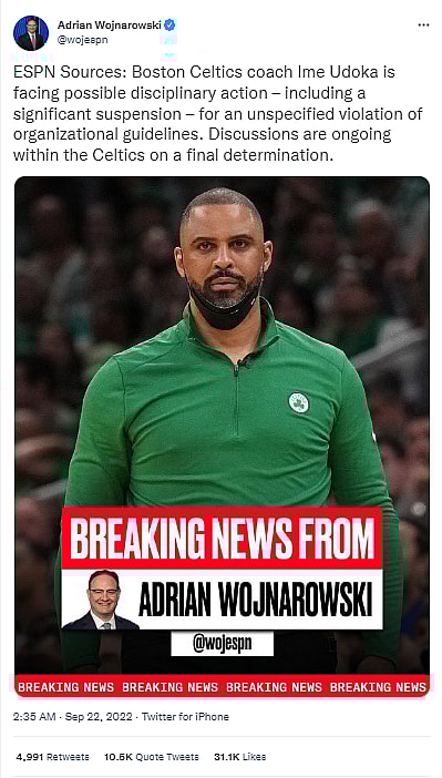 In the tweet Wojnarowski wrote, “SPN Sources: Boston Celtics coach Ime Udoka is facing possible disciplinary action – including a significant suspension – for an unspecified violation of organizational guidelines. Discussions are ongoing within the Celtics on a final determination.”