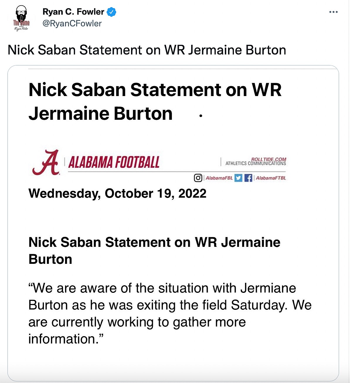 Saban initially reacted to Burton’s actions saying, “We are aware of the situation with Jermaine Burton as he was exiting the field Saturday. We are currently working to gather more information.”