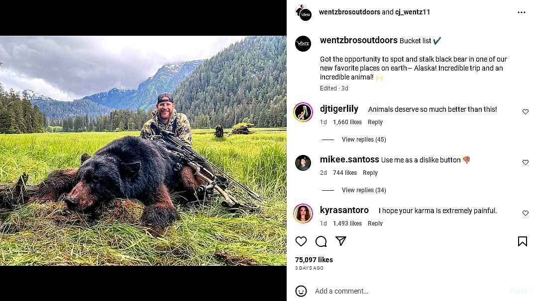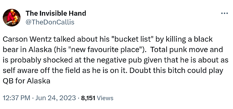 “Carson Wentz talked about his ‘bucket list’ by killing a black bear in Alaska (his ‘new favourite place’)”, one Twitter user posted in response. “Total punk move and is probably shocked at the negative pub given that he is about as self aware off the field as he is on it. Doubt this bitch could play QB for Alaska.”