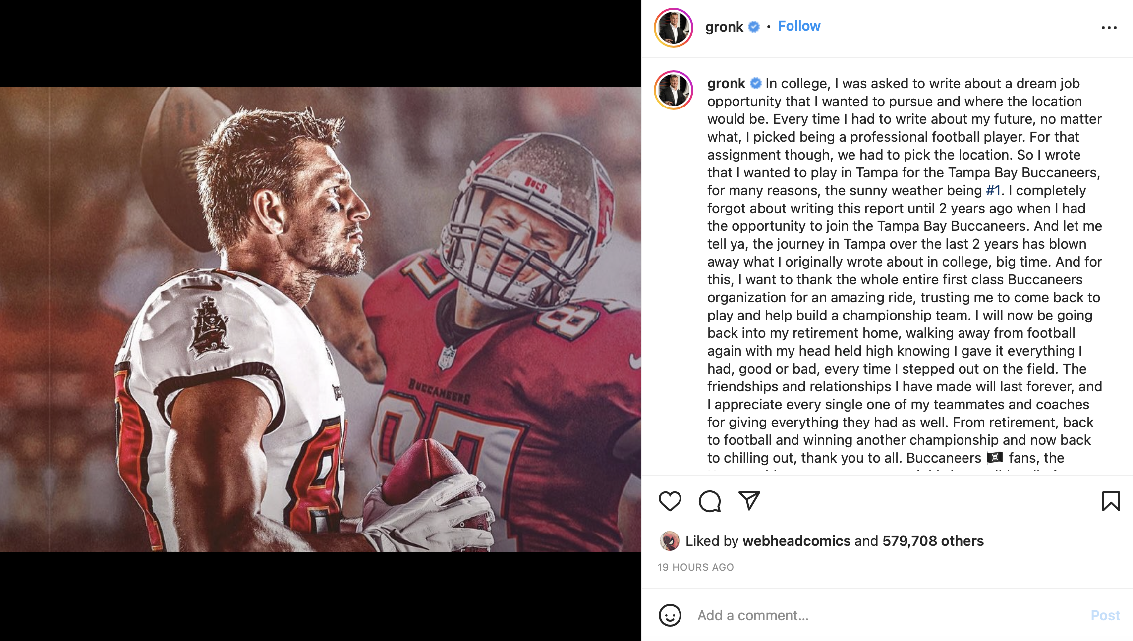 Tampa Bay Buccaneers’ tight end Rob Gronkowski announced on his Instagram account last night that he is officially retiring from the NFL.