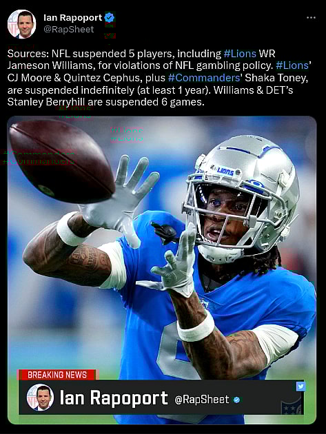 Lions safety C.J. Moore and wide receiver Quitez Cephus, along with Washington Commanders defensive end Shaka Toney, are suspended indefinitely for betting on NFL games. All three will be eligible to can petition for reinstatement after the 2023 season.