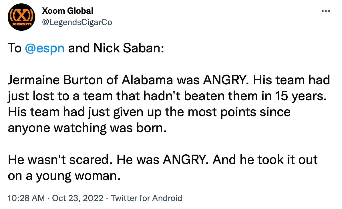 “To [ESPN] and Nick Saban,” wrote one fan, “Jermaine Burton of Alabama was ANGRY. His team had just lost to a team that hadn’t beaten them in 15 years. His team had just given up the most points since anyone watching was born.