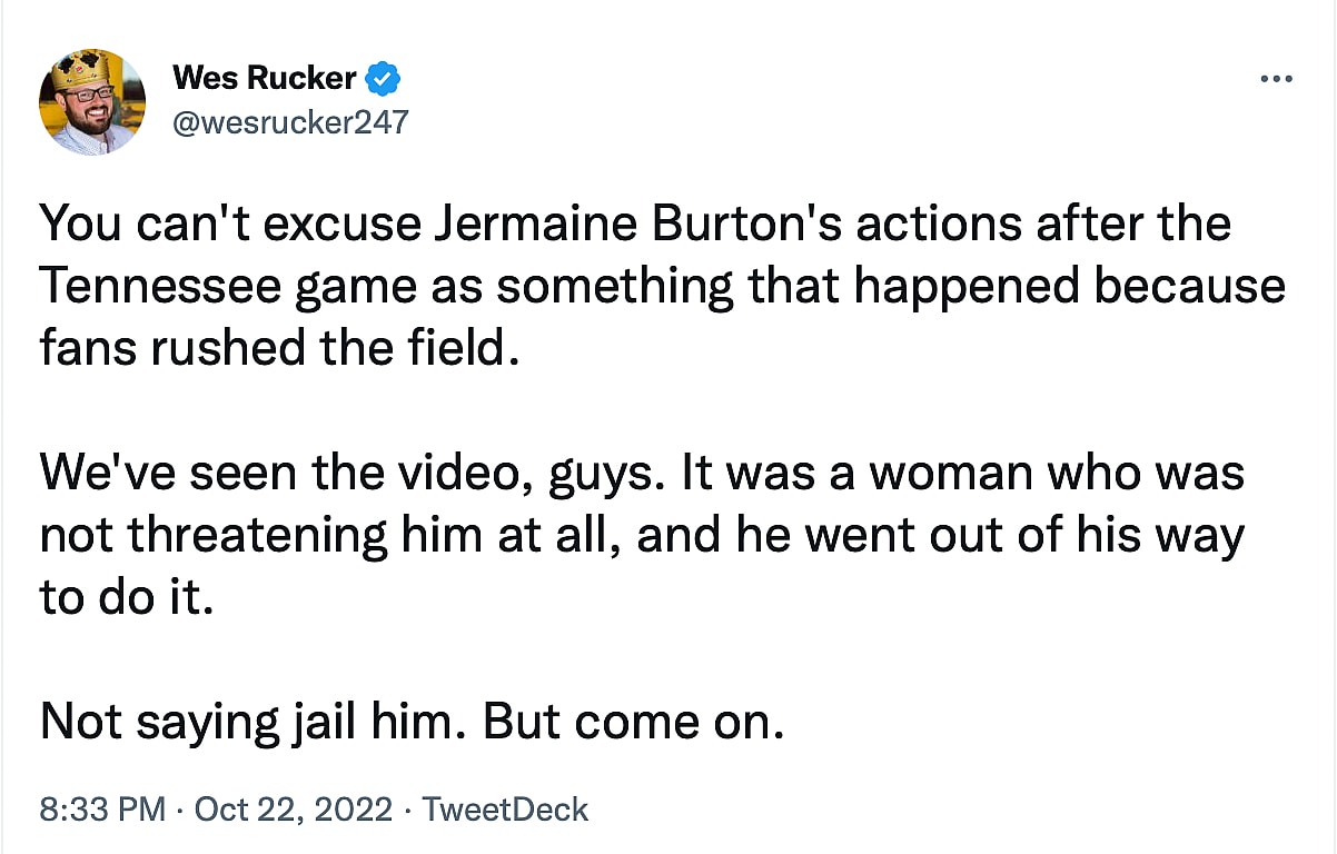 “You can’t excuse Jermaine Burton’s actions after the Tennessee game as something that happened because fans rushed the field,” said sports writer Wes Rucker. “We’ve seen the video, guys. It was a woman who was not threatening him at all, and he went out of his way to do it.