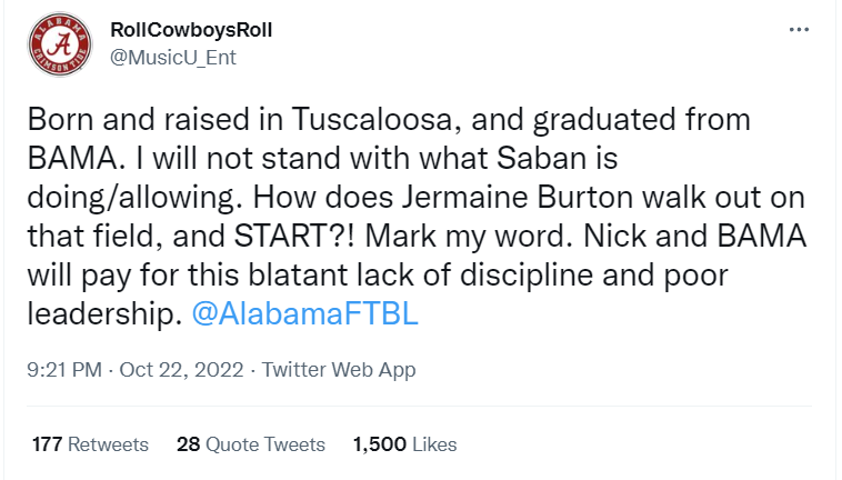Another user on Twitter wrote, “Born and raised in Tuscaloosa, and graduated from BAMA. I will not stand with what Saban is doing/allowing. How does Jermaine Burton walk out on that field, and START?! Mark my word. Nick and BAMA will pay for this blatant lack of discipline and poor leadership.”