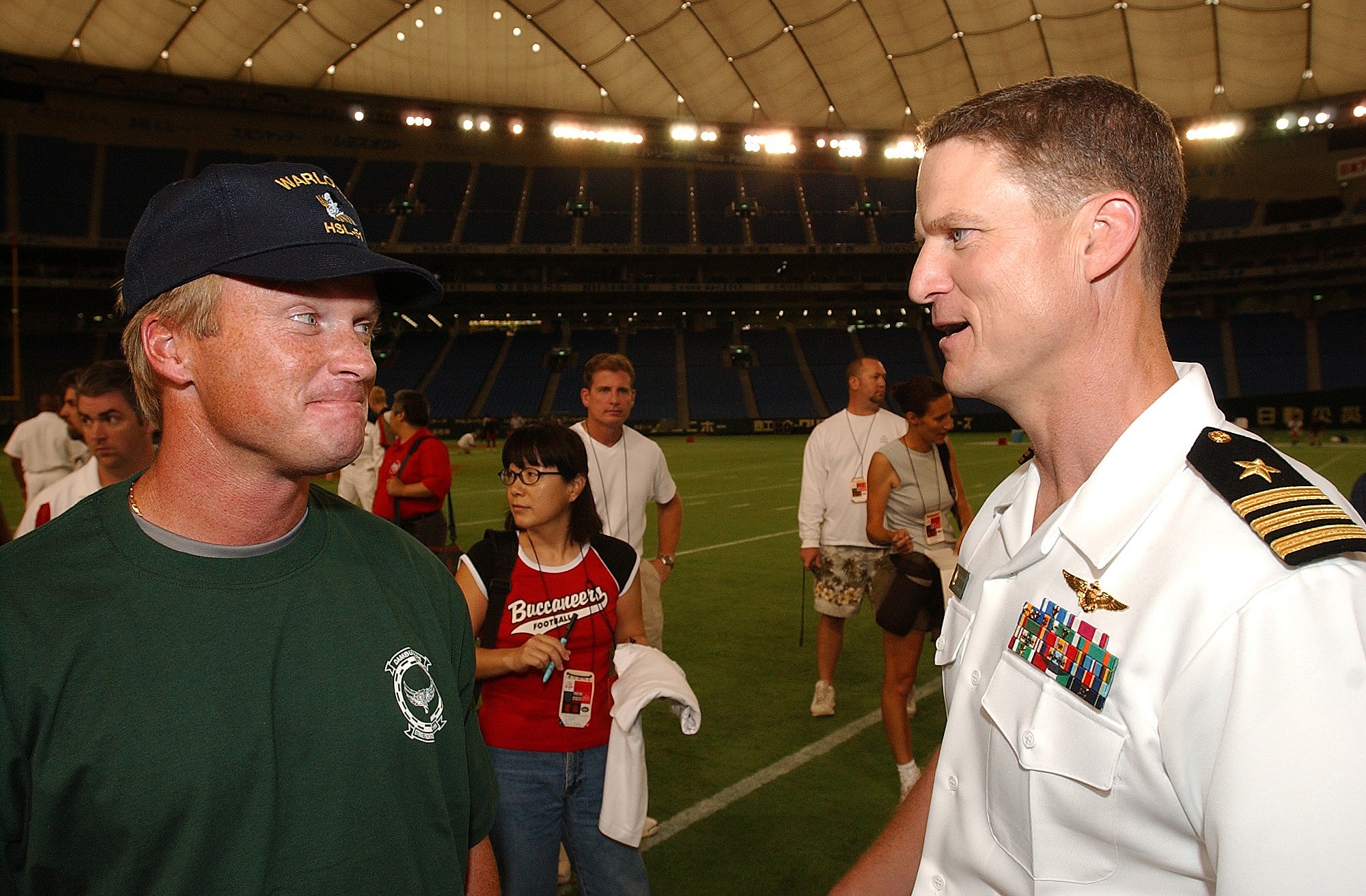 Tokyo, Japan (Aug. 1, 2003) — Cmdr. Brian Corey, Executive Officer of the ÒGolden DragonsÓ of Strike Fighter Squadron One Ninety Two (VFA-192), discusses coaching strategies in the Tokyo Dome with Head Coach John Gruden of the National Football League (NFL) Tampa Bay Buccaneers. Personnel assigned to Carrier Air Wing Five (CVW-5) were invited to the dome to meet with the players of both the Tampa Bay Buccaneers and The New York Jets. Both teams will meet in tomorrowÕs Tokyo Bowl for a preseason National Football League (NFL) game. U.S. Navy photo by PhotographerÕs Mate 3rd Class John E. Woods. (RELEASED)
