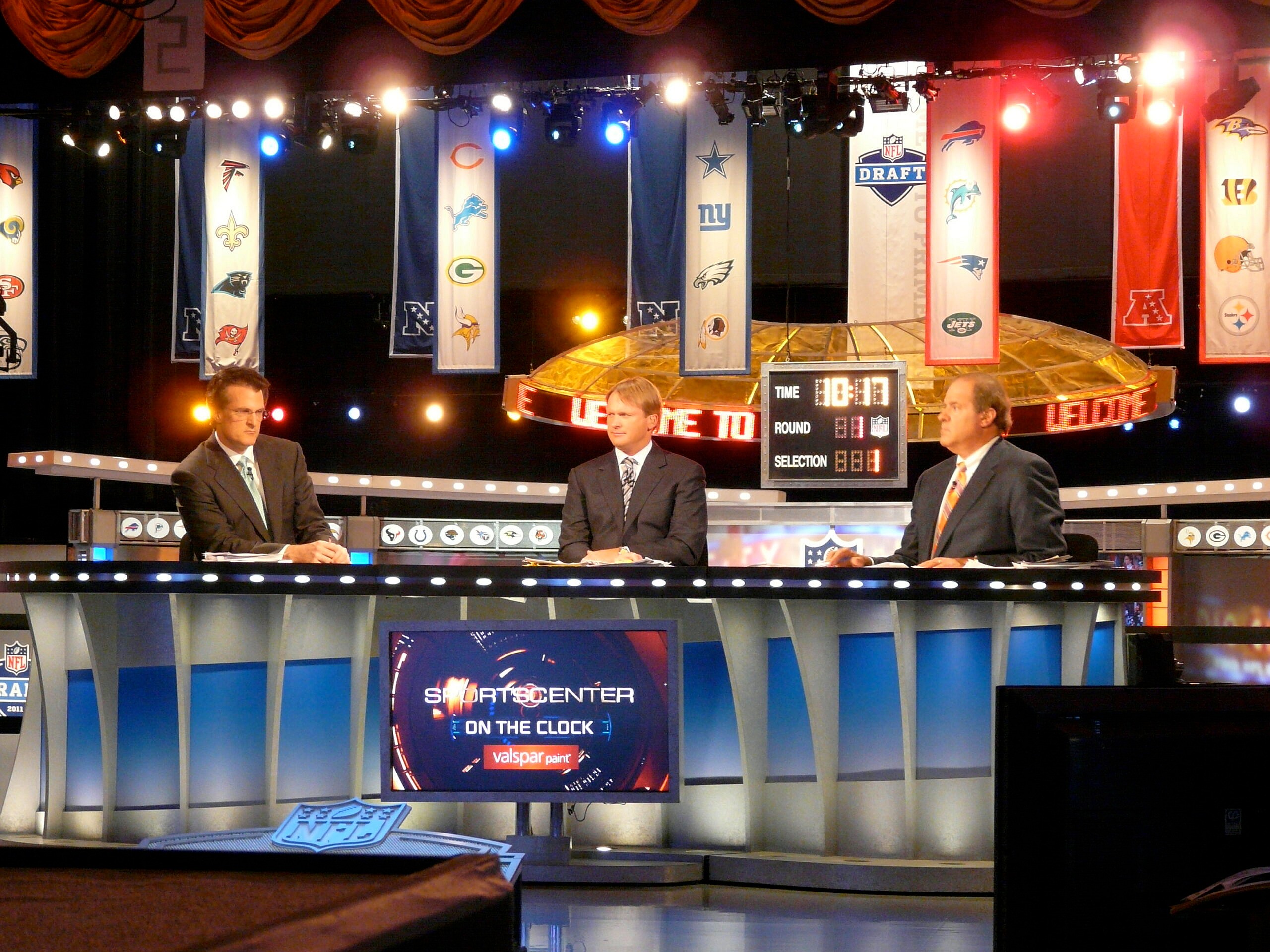 Jon Gruden (center) with Mel Kiper Jr. and Chris Berman on the ESPN set during the 2011 NFL Draft. Photo Credit: Marianne O’Leary, CC BY 2.0 <https://creativecommons.org/licenses/by/2.0>, via Wikimedia Commons