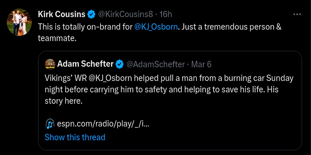 Osborn’s heroism drew praise from media and fans, and especially some of his teammates, online. In particular, Kirk Cousins posted on Twitter that he wasn’t surprised by his fellow Vikings’ act of courage.