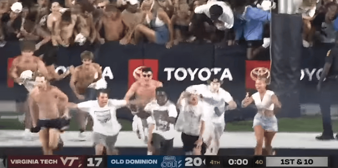 Old Dominion University fans storm the field after defeating Virginia Tech via PSC Highlights YouTube