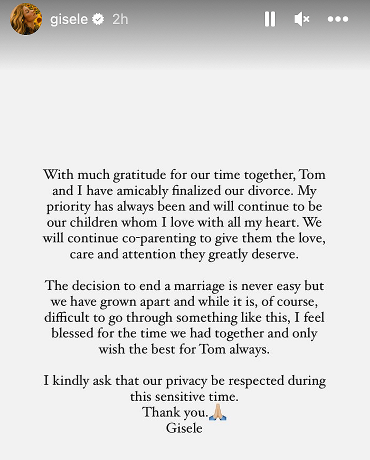 Bündchen posted her official announcement on her Instagram Stories as well roughly around the same time Brady posted his. She wrote, “With much gratitude for our time together, Tom and I have amicably finalized our divorce.