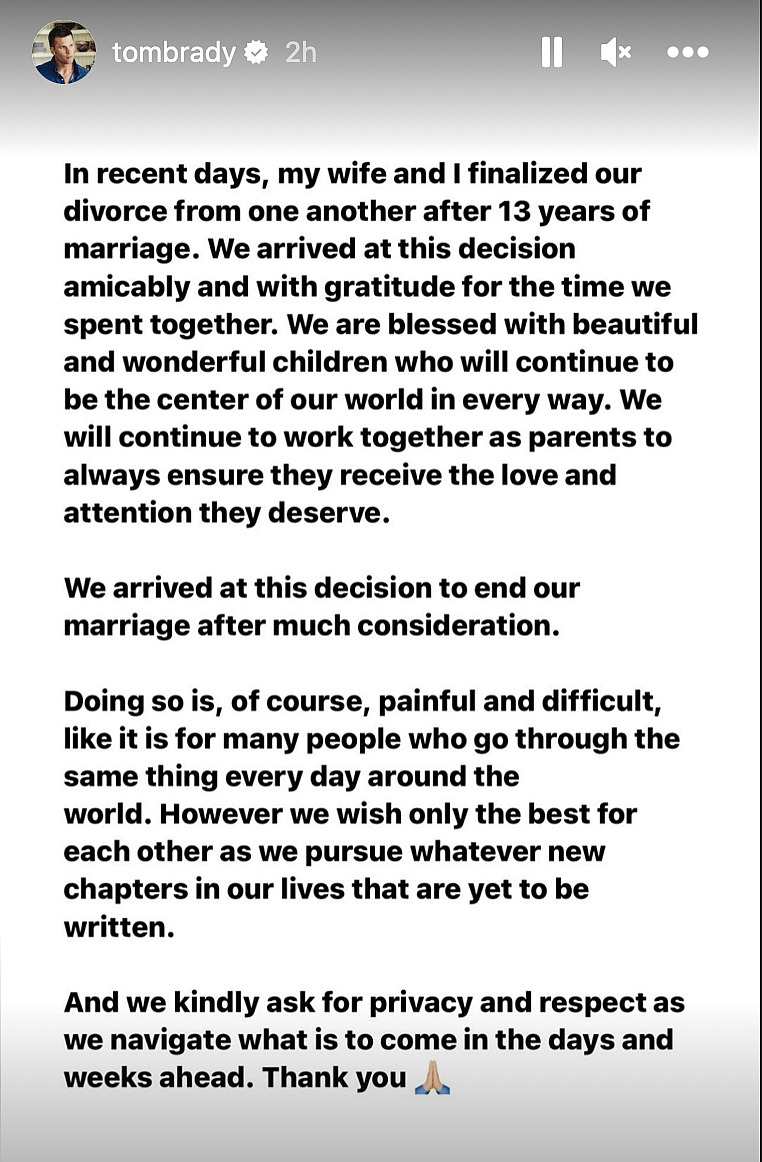“In recent days, my wife and I finalized our divorce from one another after 13 years of marriage,” Brady said in a post to his Instagram Stories on Friday.
