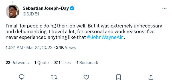 In a rather odd turn of events, Joseph-Day said that the incident occurred Friday at Orange County’s John Wayne Airport. The Chargers star felt strongly enough that his rights had been violated that he went to social media to air his grievances.