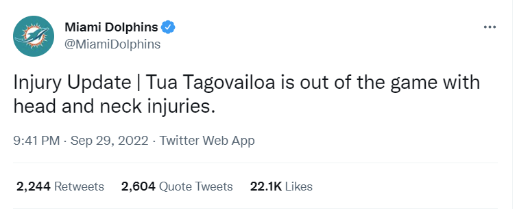 TUA with a concussion. Definitely done. #dolphins #bills pic.twitter.com/aWKzXKesBM